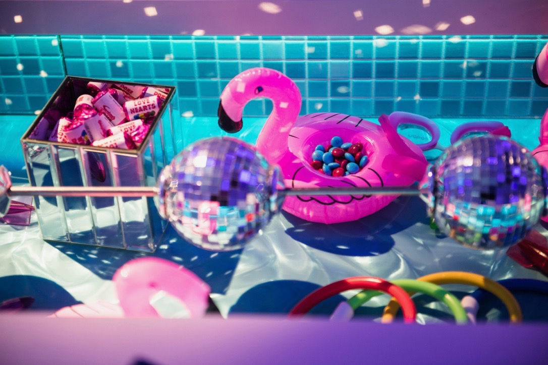 We had bespoke tables built for the younger guests to dine at, the inside of which were created to look like swimming pools running the length of them, with mosaic tiles and pool toys completing the look. To keep with the theme, the adult’s tables were adorned with blue and white hydrangeas, whilst soaring palm trees, running the length of the room, brought a tropical touch.